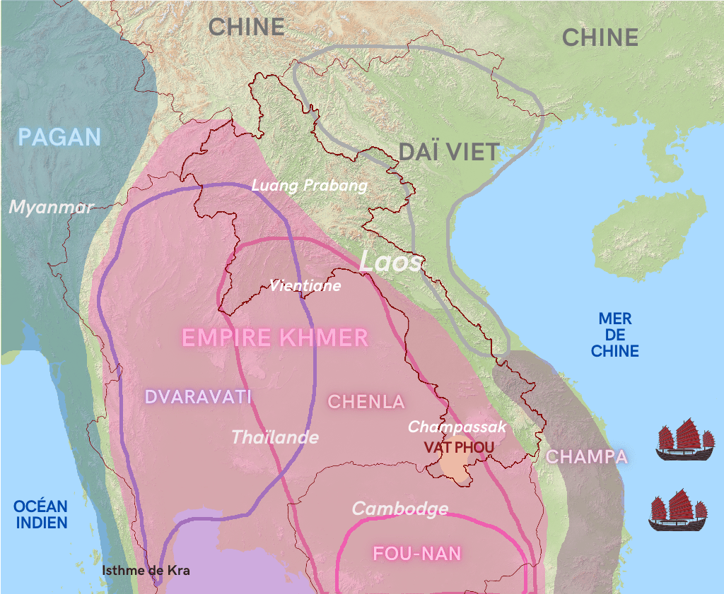 En 802, Jayavarman II fonde l'empire d'Angkor. Le sud du Laos est alors totalement intégré à cette puissance. Les structures que nous visitons aujourd'hui au Vat Phou, classées au patrimoine mondial de l'UNESCO, datent majoritairement des XIe et XIIe siècles, sous les règnes de Jayavarman VI et Suryavarman II.