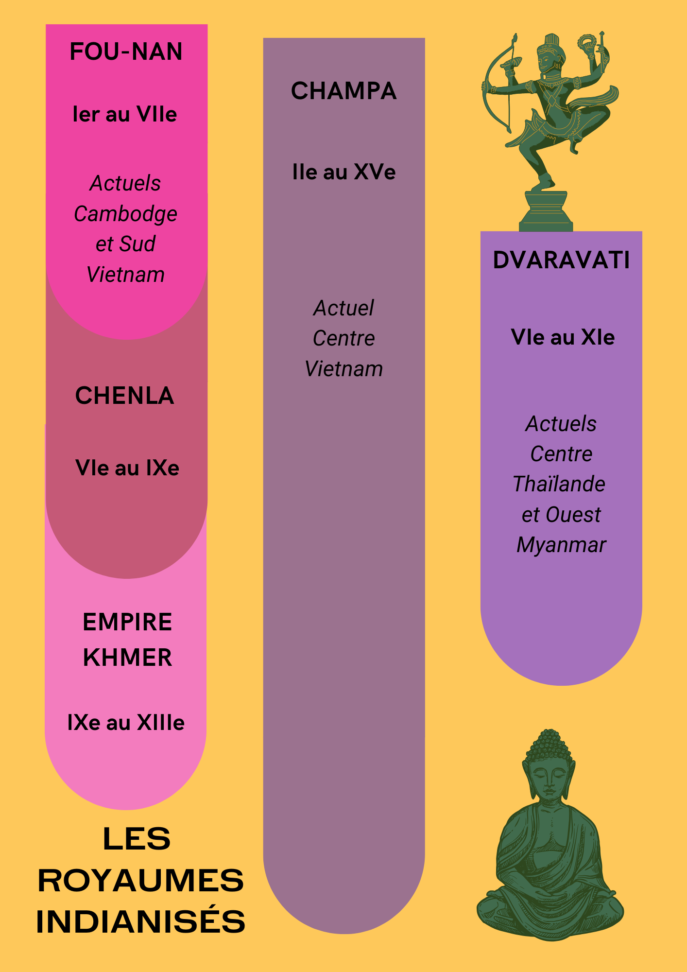 Dès le Ve siècle avant notre ère, l’Inde connaît une effervescence économique et artistique qui se diffuse par les voies maritimes. La péninsule indochinoise, alors dans sa phase finale de la préhistoire, voit s'établir sur ses côtes et le long de ses fleuves des royaumes dits "indianisés".